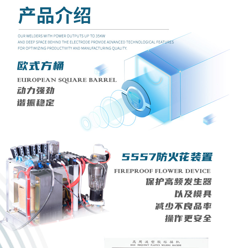 | 機器特點: | 采用上、下高周輸出,焊接牢固;高Q值真空電子管 , 輸出功率穩(wěn)定 ,NL-5557高周波火花保護系統(tǒng),靈敏度極高,防止燒損高周波模具 |