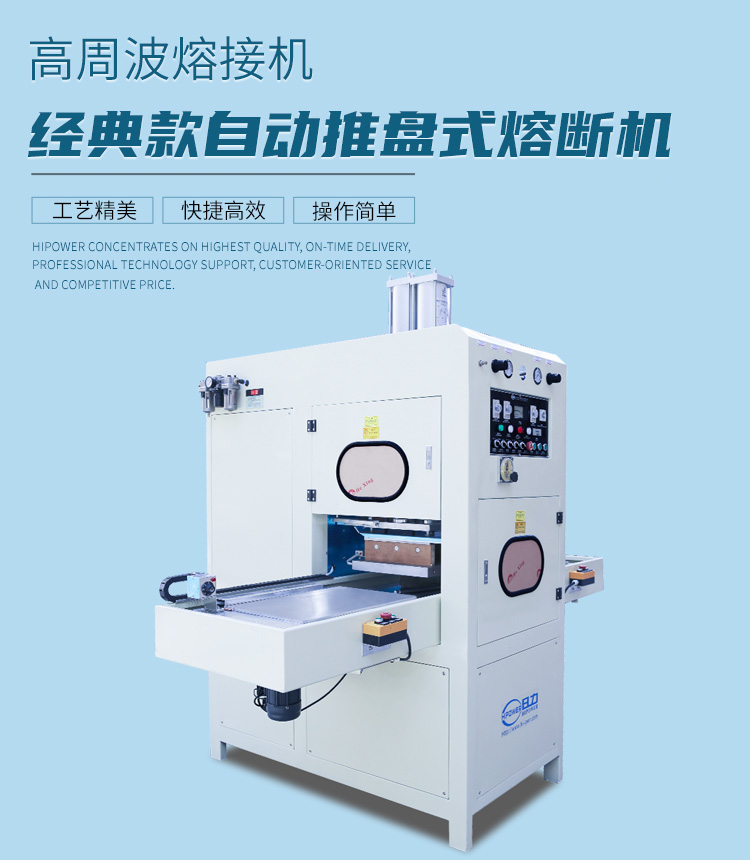 主要用于需要高周波熔接同時又必須同步裁斷的產(chǎn)品加工,高周波機的工作原理是利用高周波先熔接再通過機器配有的壓力裝置同時切斷。因為是同時完成,所以稱為高周波同步熔斷機。也稱為高周波熔斷機、熔斷機、高周波同步裁斷機、高周波裁斷機。主要適用于APET、PETG、GAG環(huán)保材質(zhì)的雙面吸塑泡殼的封口包裝、吸塑紙卡包裝、牙刷封口包裝,以及EVA布類皮革、真皮、OPP、PU、表帶、吊帶、熱水袋、保暖袋等需要熔接又要同步熔斷的產(chǎn)品。