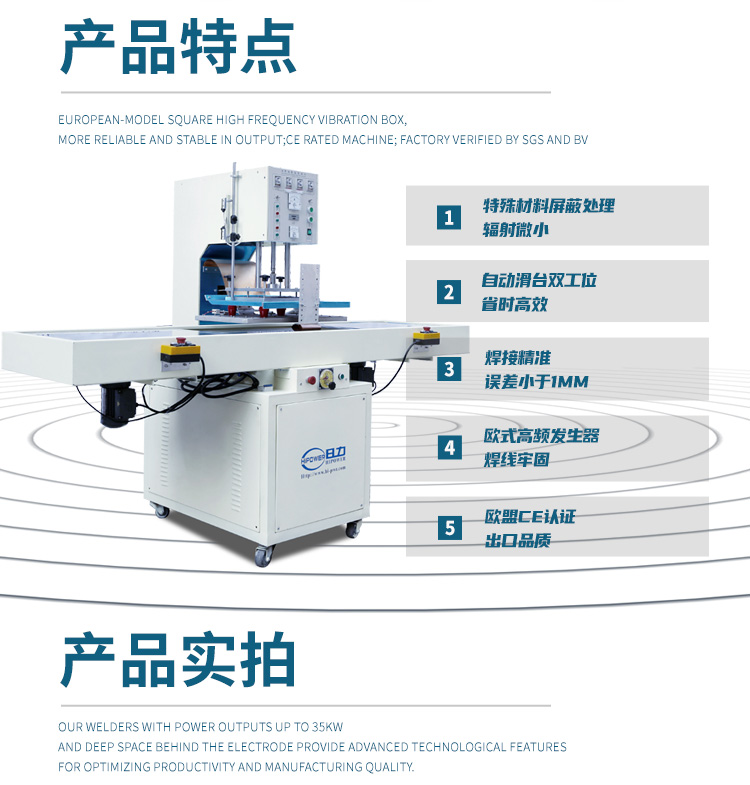 用途: 主要用于需要高周波熔接同時又必須同步裁斷的產品加工,高周波機的工作原理是利用高周波先熔接再通機器配有的壓力裝置同