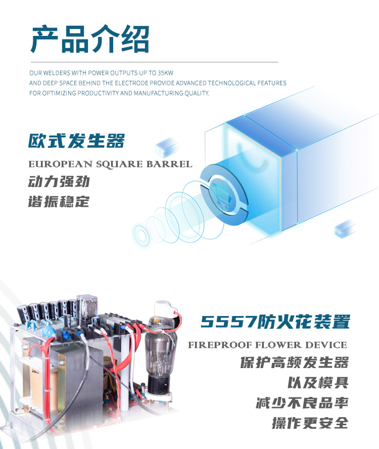 ★本高周波熔接機(jī)采用低損耗的歐洲制式同軸高頻諧振器,高周波輸出電力強(qiáng)大,能使制品熔接,大大提高了生產(chǎn)產(chǎn)量。機(jī)器設(shè)有高周波頻率穩(wěn)定器,以及高周波屏蔽裝置。將高頻干擾降低,避免電波干擾。同時(shí)可以避免由不當(dāng)操作所引起的頻率漂移,使電極和物料損壞減低同時(shí)警告燈亦發(fā)亮示警。