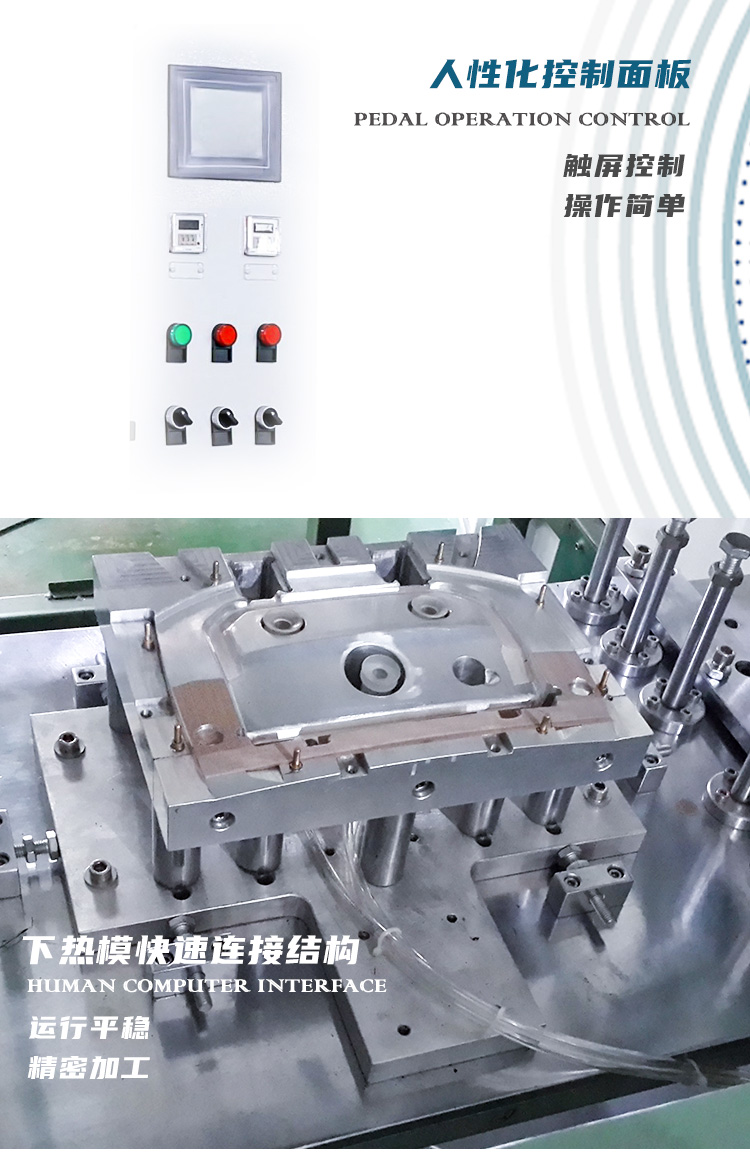 ※熱板機(jī)整機(jī)結(jié)構(gòu)特點(diǎn):采用國標(biāo)優(yōu)質(zhì)矩形鐵管焊接而成,表面再經(jīng)噴塑工藝處理。門板由數(shù)控折彎機(jī)及沖床加工成型后,表面再經(jīng)噴塑工藝處理。熱板移動(dòng)機(jī)構(gòu)由氣缸、滑塊導(dǎo)軌、熱板等部件組成。氣缸作為動(dòng)力源,帶動(dòng)熱板機(jī)構(gòu)沿兩條滑塊導(dǎo)軌前后作直線運(yùn)動(dòng)。熱板焊接機(jī)部件:由熱板模、加熱板組成,熱板模與加熱板通過快速定位緊固機(jī)構(gòu),與熱板移動(dòng)機(jī)構(gòu)連接。熱板機(jī)結(jié)構(gòu)的特點(diǎn)是:熱板在運(yùn)動(dòng)時(shí),平穩(wěn)且運(yùn)動(dòng)間隙小。熱板機(jī)構(gòu)上,帶加熱板及上、下熱模,以及加熱板固定熱模的快速聯(lián)接機(jī)構(gòu),能夠有效快速更換不同產(chǎn)品,優(yōu)化了其使用范圍、提高了生產(chǎn)效率。熱板機(jī)上、下模板通過4根限位導(dǎo)桿與熱板焊接機(jī)聯(lián)接在一起,可以精確調(diào)整焊接深度,共同組成一個(gè)設(shè)備的主要運(yùn)動(dòng)部件。