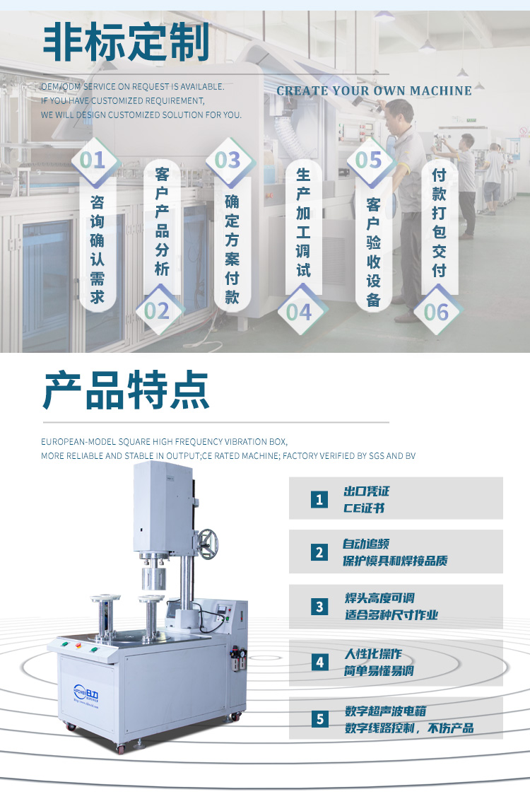 機(jī)器特點(diǎn): 4200W,最大直徑200mm, 超聲波圓筒底蓋焊接機(jī)四工位自動(dòng)轉(zhuǎn)盤循環(huán)驅(qū)動(dòng),精密分割器定位,采用超聲波原理粘合,效果牢固美觀且無(wú)刮痕。 能滿足不同直徑、高度、材料厚度的圓筒底蓋粘合,機(jī)器操作簡(jiǎn)單高效,可與日力公司HY-2030全自動(dòng)圓筒卷邊機(jī)對(duì)接使用,實(shí)現(xiàn)流水線生產(chǎn)。