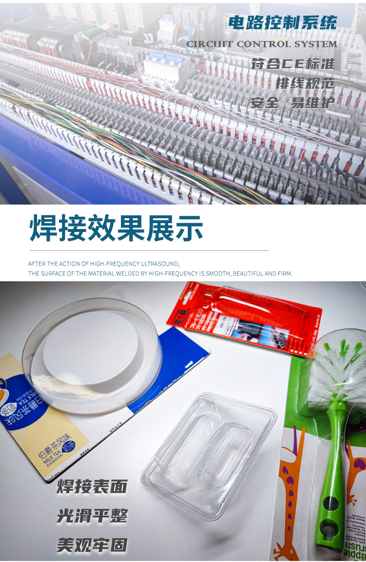 主要用于需要高周波熔接同時又必須同步裁斷的產(chǎn)品加工,高周波機(jī)的工作原理是利用高周波先熔接再通過機(jī)器配有的壓力裝置同時切斷。因為是同時完成,所以稱為高周波同步熔斷機(jī)。也稱為高周波熔斷機(jī)、熔斷機(jī)、高周波同步裁斷機(jī)、高周波裁斷機(jī)。主要適用于APET、PETG、GAG環(huán)保材質(zhì)的雙面吸塑泡殼的封口包裝、吸塑紙卡包裝、牙刷封口包裝,以EVA布類皮革、真皮、OPP、PU材質(zhì)的熔接及熔斷。