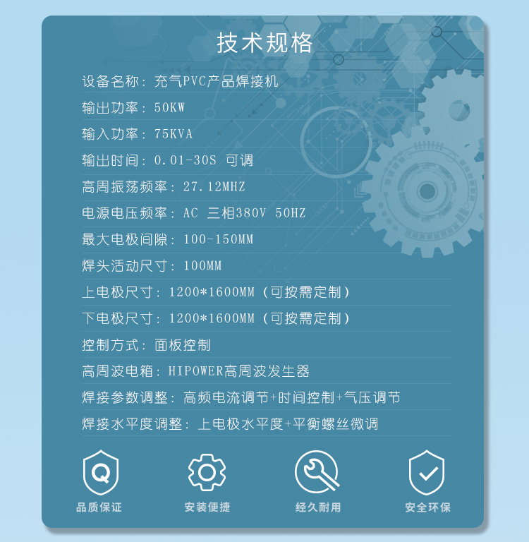| 適用范圍: | 大型高周波熔接機(jī)專用焊接:救生衣、漂流艇、漂流船、浮排、窗簾、浴簾、充氣水池、游泳池、保健床墊、玉石床墊、充氣床墊、吹氣沙發(fā)等 |
