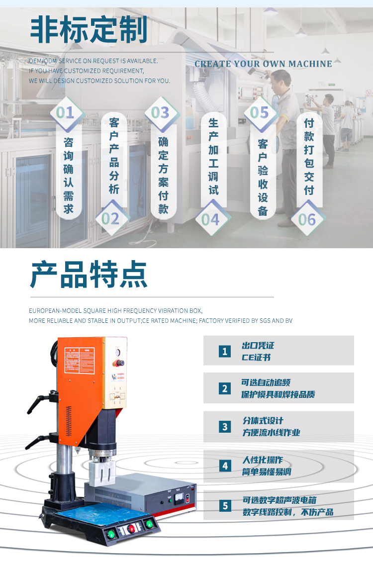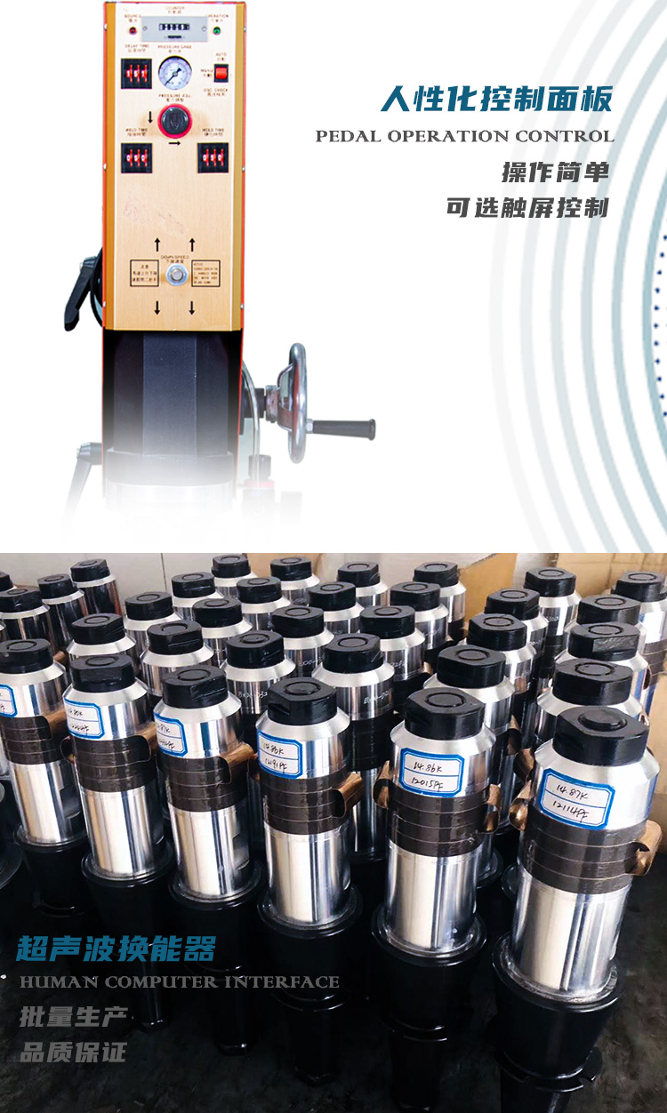 | 機(jī)器特點(diǎn): | 超聲波振動(dòng)隨著超聲波焊接模具,將超聲波能量傳導(dǎo)至塑膠表面焊,因此產(chǎn)生局部高溫,使塑膠表面熔化。在超聲波焊接機(jī)的壓力下,使兩件塑膠達(dá)到熔接、美觀、堅(jiān)固的效果 |