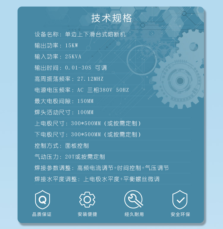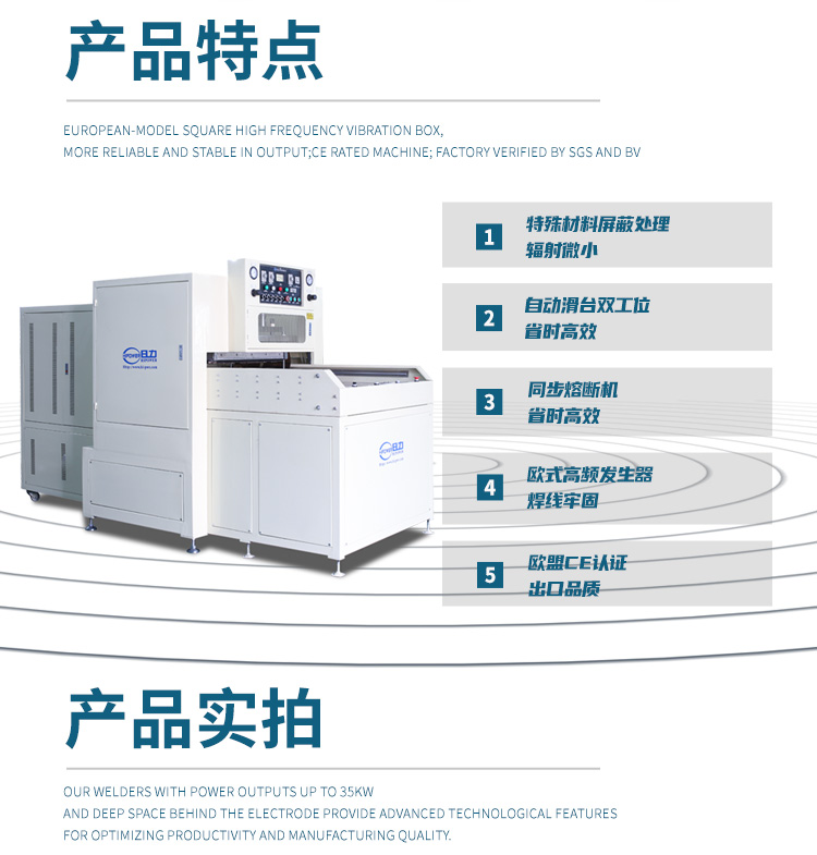 | 機(jī)器特點(diǎn): | 1 上下垂直滑臺(tái)采用臺(tái)灣馬達(dá)驅(qū)動(dòng),工位定位精準(zhǔn)。2.熔斷機(jī)配有NL-5557高周波火花保護(hù)系統(tǒng),防止燒損高周波模具 3. 增壓30T裁切壓力,裁切PVC,PP或環(huán)保料無(wú)憂無(wú)慮 |